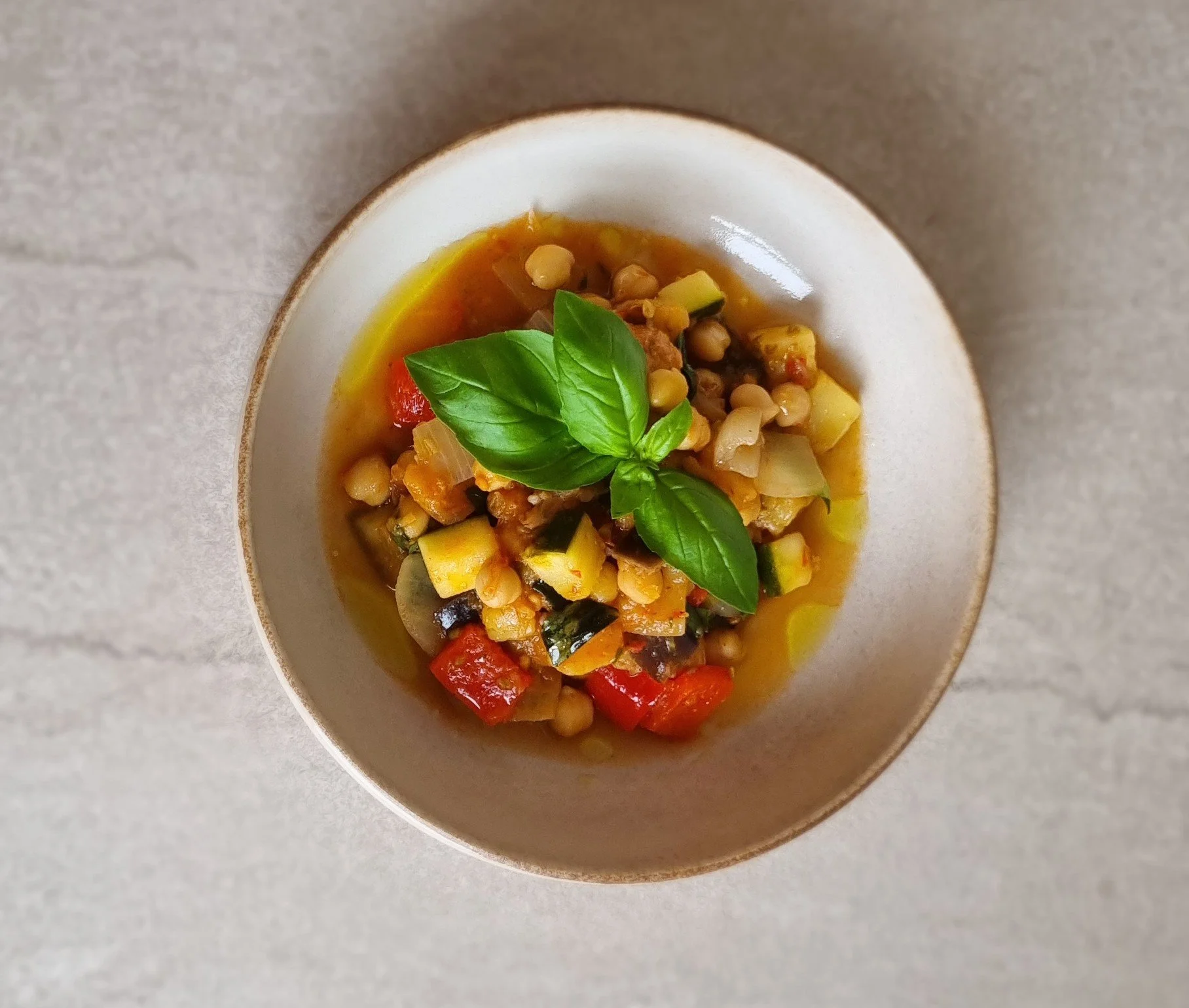 Divide chickpea ratatouille between serving bowls and top with fresh basil to serve.